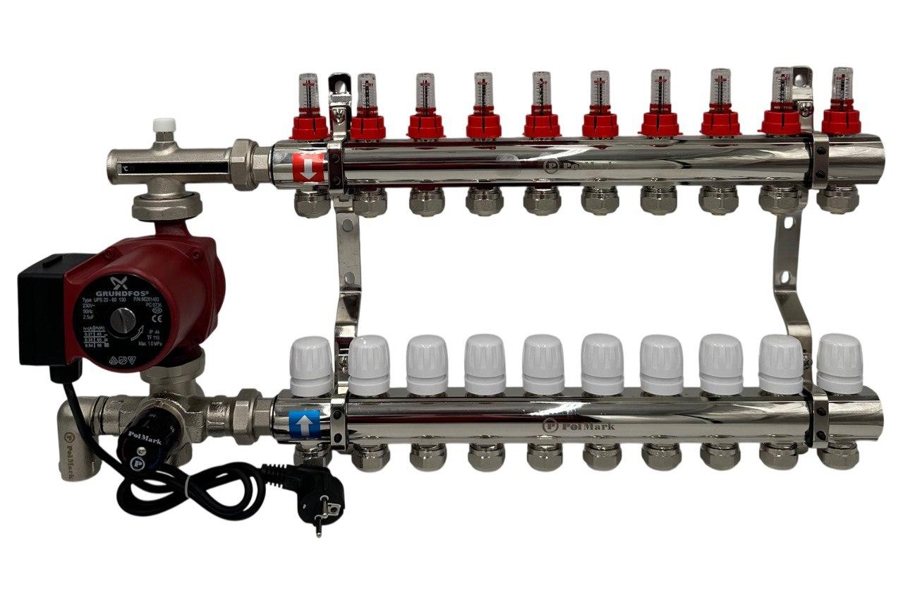 Колектор для теплої підлоги Polmark 9 контурів (Латунь) з трьох ходовим клапаном у зборі з насосом Польща
