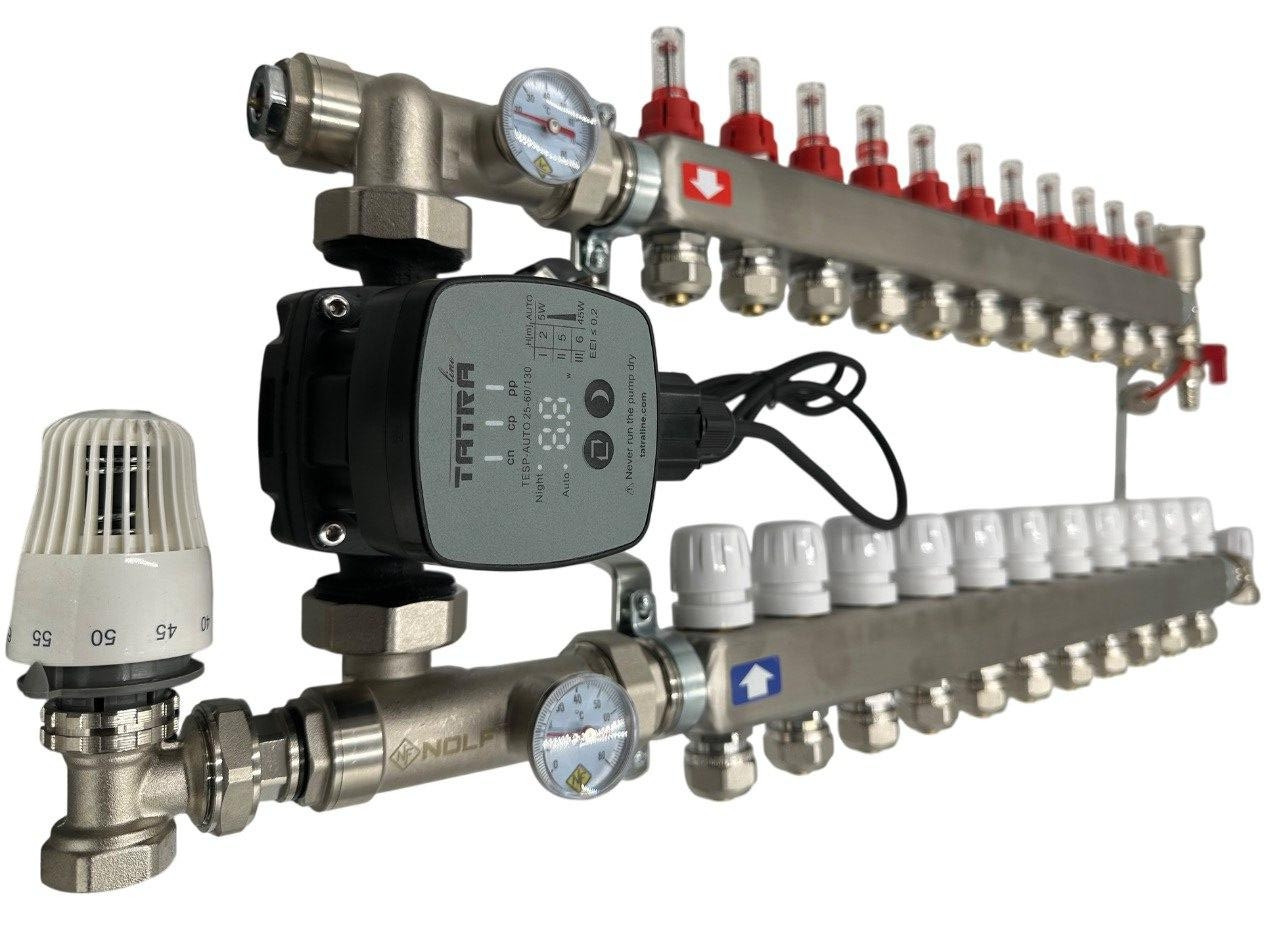 Колектор для теплої підлоги Nolf на 11 контурів (Нержавіюча сталь) в зборі з частотним насосом (бічне підключення) Німеччина